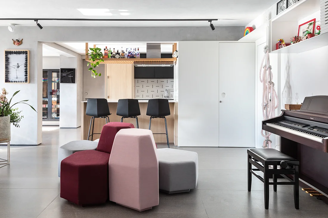 O que se vê nas fotos é o resultado do complexo pedido deste cliente: um loft no andar inferior com dois banhos e mini-cozinha, um andar intermediário com o living, cozinha e lavabo e a suíte máster no andar superior. Uma configuração bem distinta da anterior, que contava com lavanderia apesar do condomínio já oferecer esse serviço.