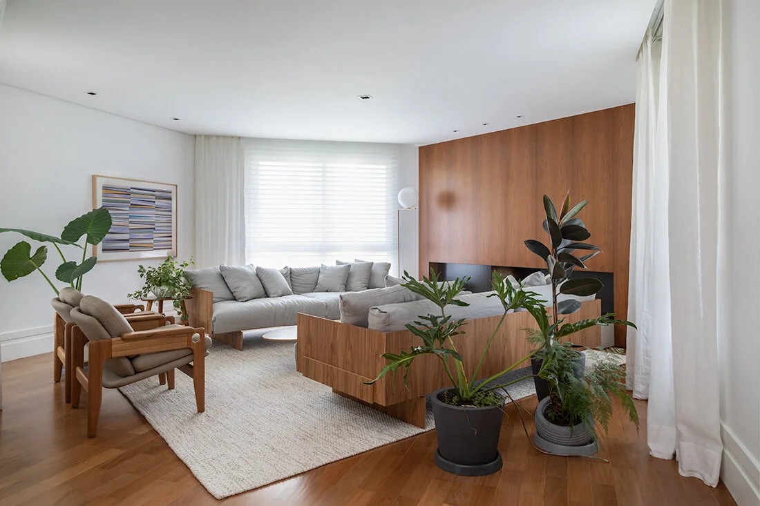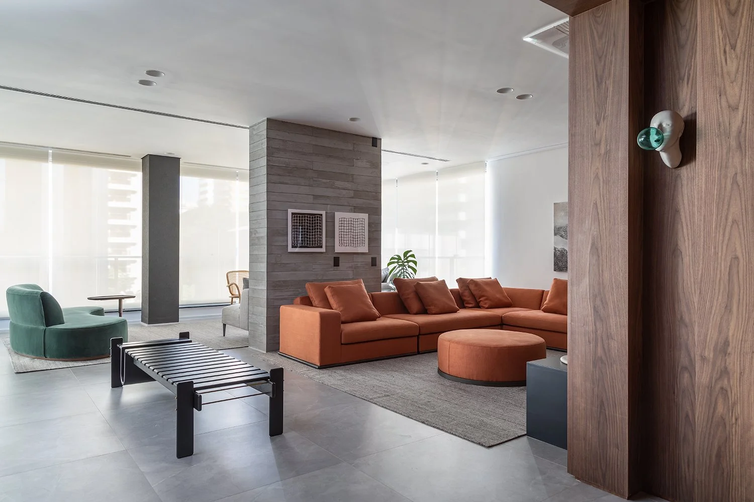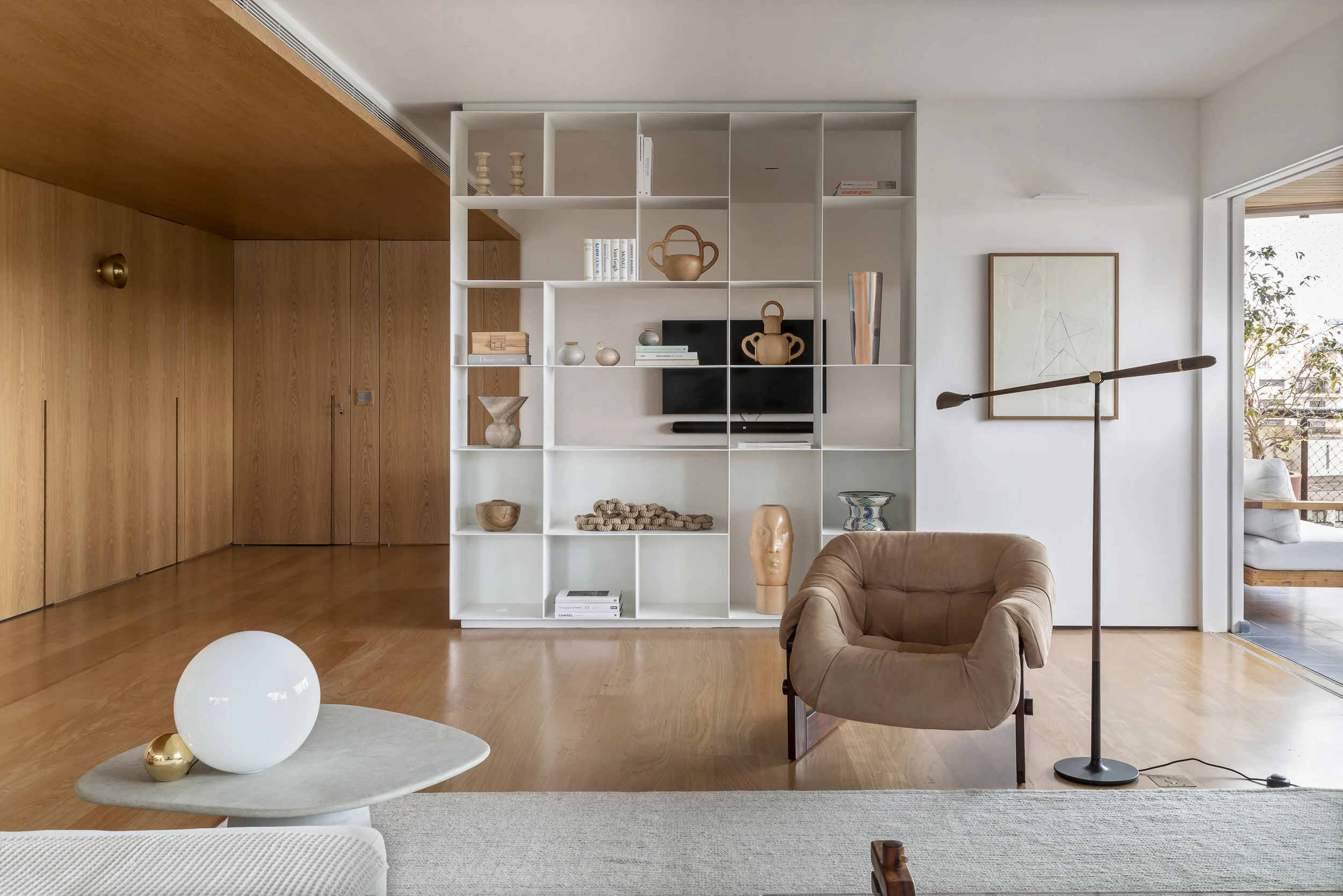 No passado, ambientes tornavam-se frios com o uso de tons muito suaves. Tudo era emulação do branco de galeria de arte, que deixava um aspecto árido, sem aconchego, uma linguagem própria dos lugares de passagem. Hoje, com mais possibilidade de cores, os tons suaves se tornaram acolhedores, para lugares de permanência, como se vê no apartamento Park Vila Mariana; de tonalidades terrosas, madeira clara e base cru. As escolhas reforçam afetividade e ampliam o imóvel.