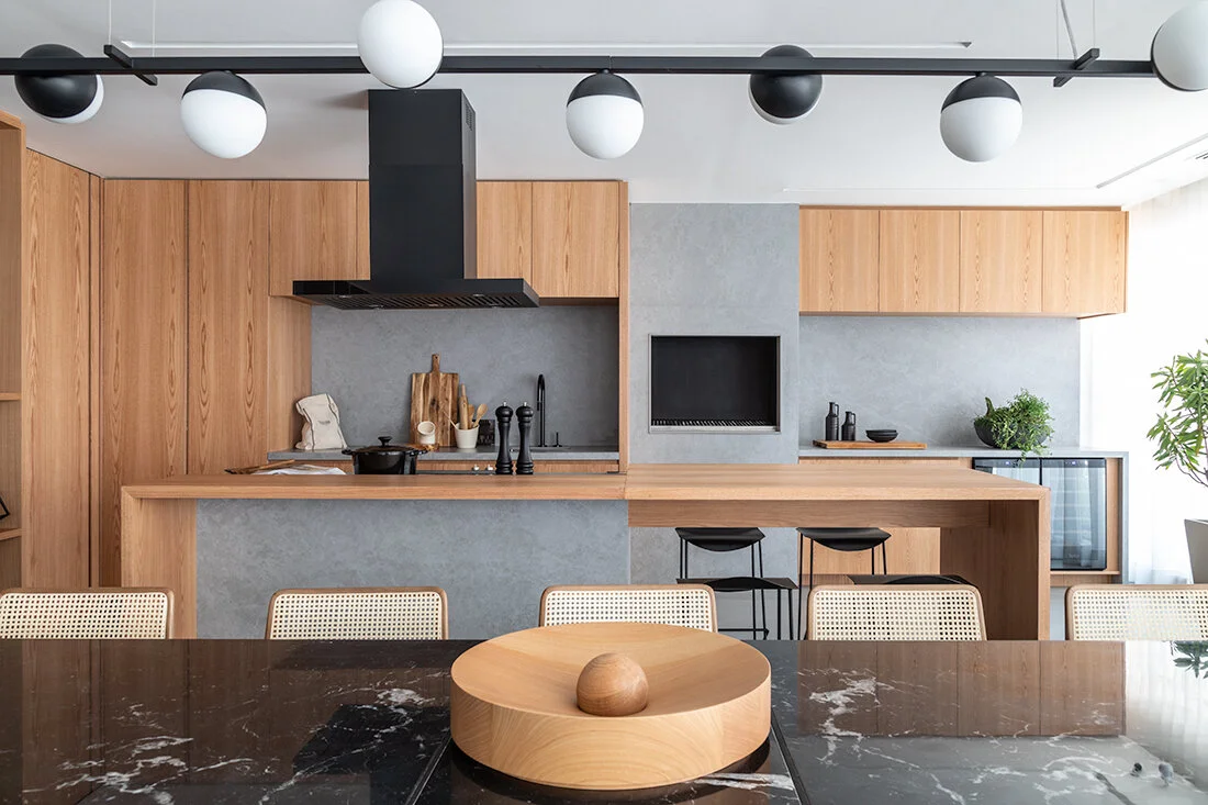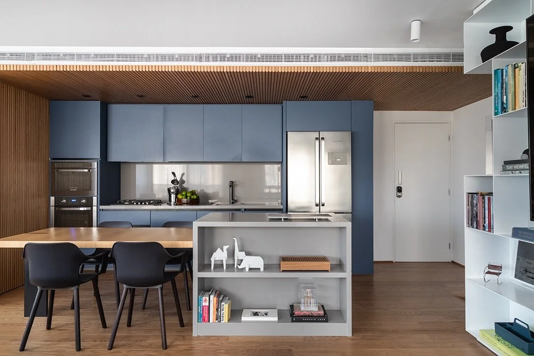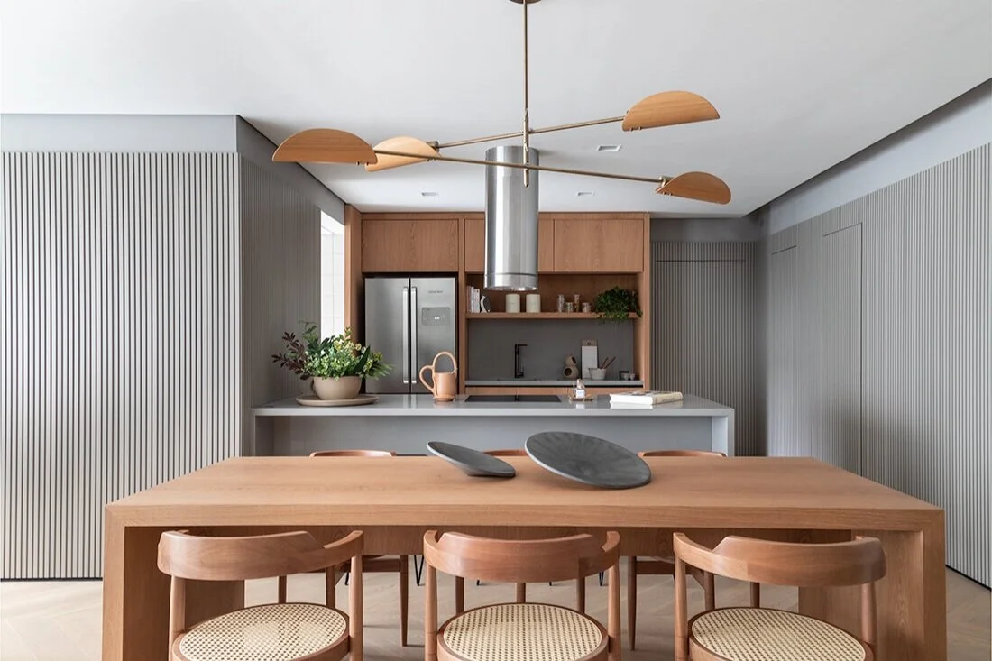 Uma das vantagens da grande planta do apartamento é ter duas cozinhas. Uma delas é integrada com a sala de almoço, mas para preservar a intimidade em certos momentos, foram instalados brises de madeira que podem ficar abertos ou fechados.