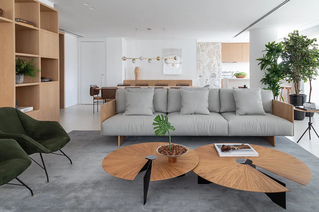 Outra característica importante foi usar na estante uma chapa metálica, que deu leveza para uma peça de vários níveis. O espaço entre objetos foi importante neste projeto, com a cozinha aberta, totalmente integrada à sala de estar. Aqui, os 146 m2 parecem ainda maiores e as formas arredondadas presentes nas luminárias e móveis, nos espelhos e nas cadeiras, ajudam nessa percepção. Uma linguagem contemporânea de design e de estilo de vida, onde os ambientes são integrados de forma fluida e natural com o uso da madeira para aquecer e trazer aconchego. Sem excessos, mas com personalidade.