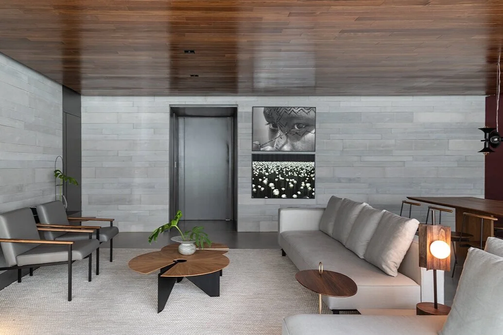 O extenso painel de lâmina de ash chumbo mimetiza as portas de acesso à área íntima e de serviço e são uma assinatura dos projetos do SALA 2.