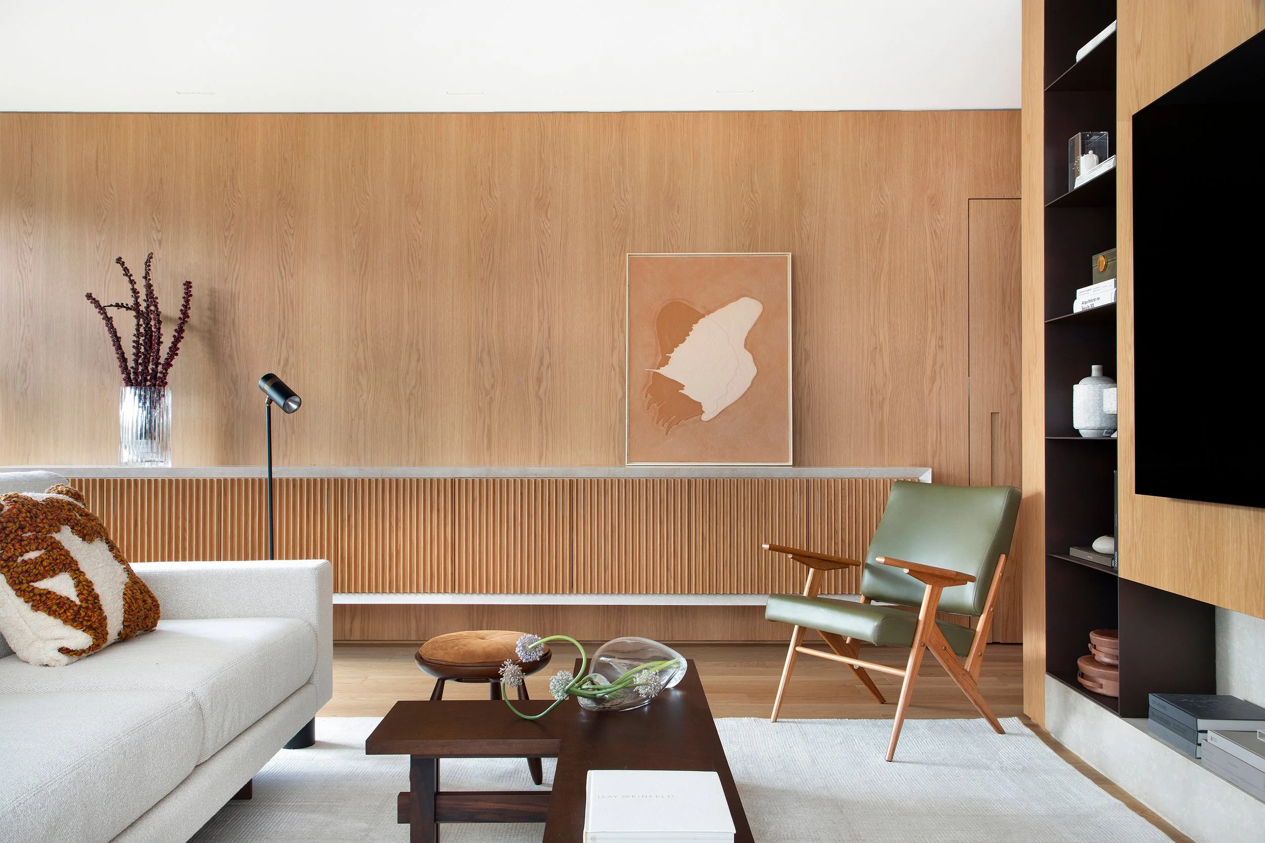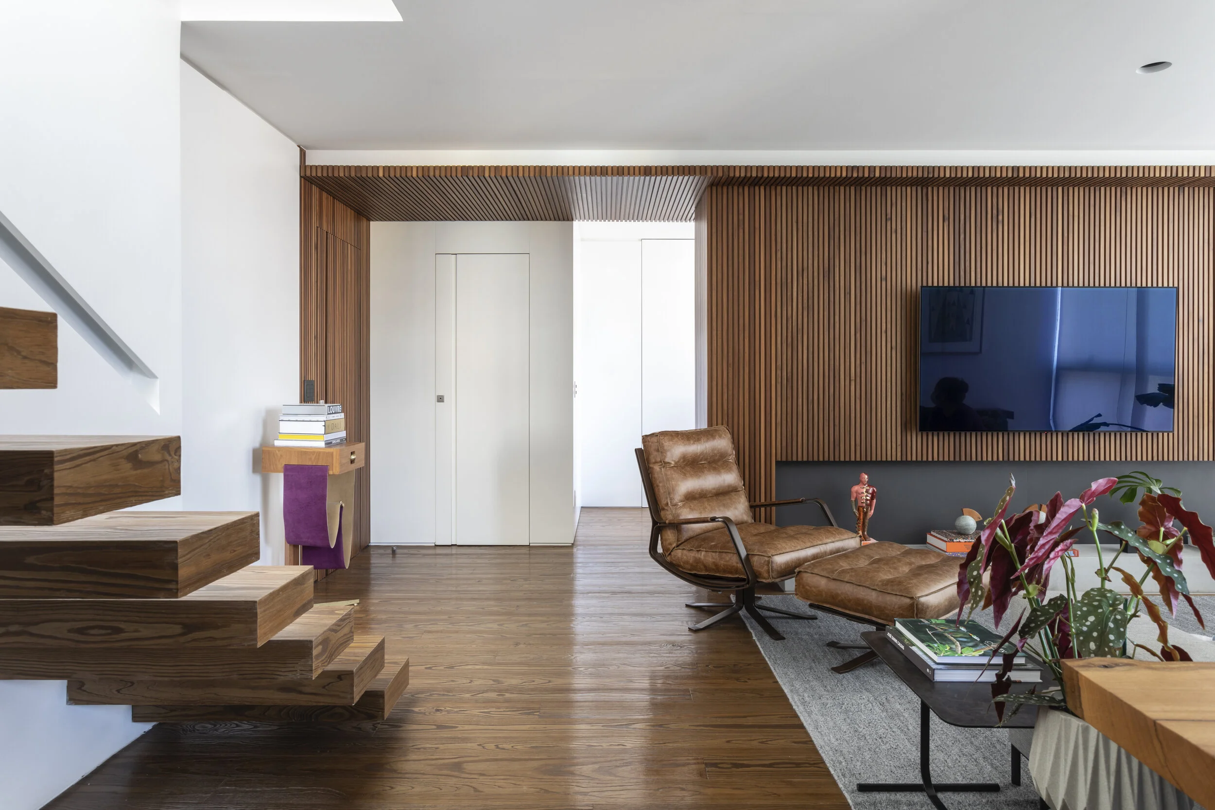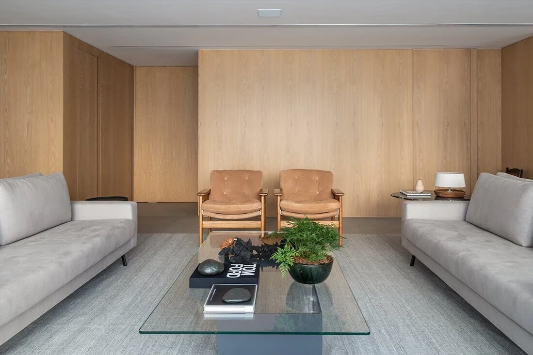 Tudo está harmonioso. O couro e a madeira são da mesma tonalidade, uniformes na elegância. O tapete de fibra natural e o tecido do mobiliário, idem. A repaginada contemporânea foi plenamente constituída com a reforma do antigo corredor de entrada: o forro no teto em formato oval deu lugar ao cubo de madeira que dá acesso para a área social e privativa. Uma autêntica caixa para o futuro.