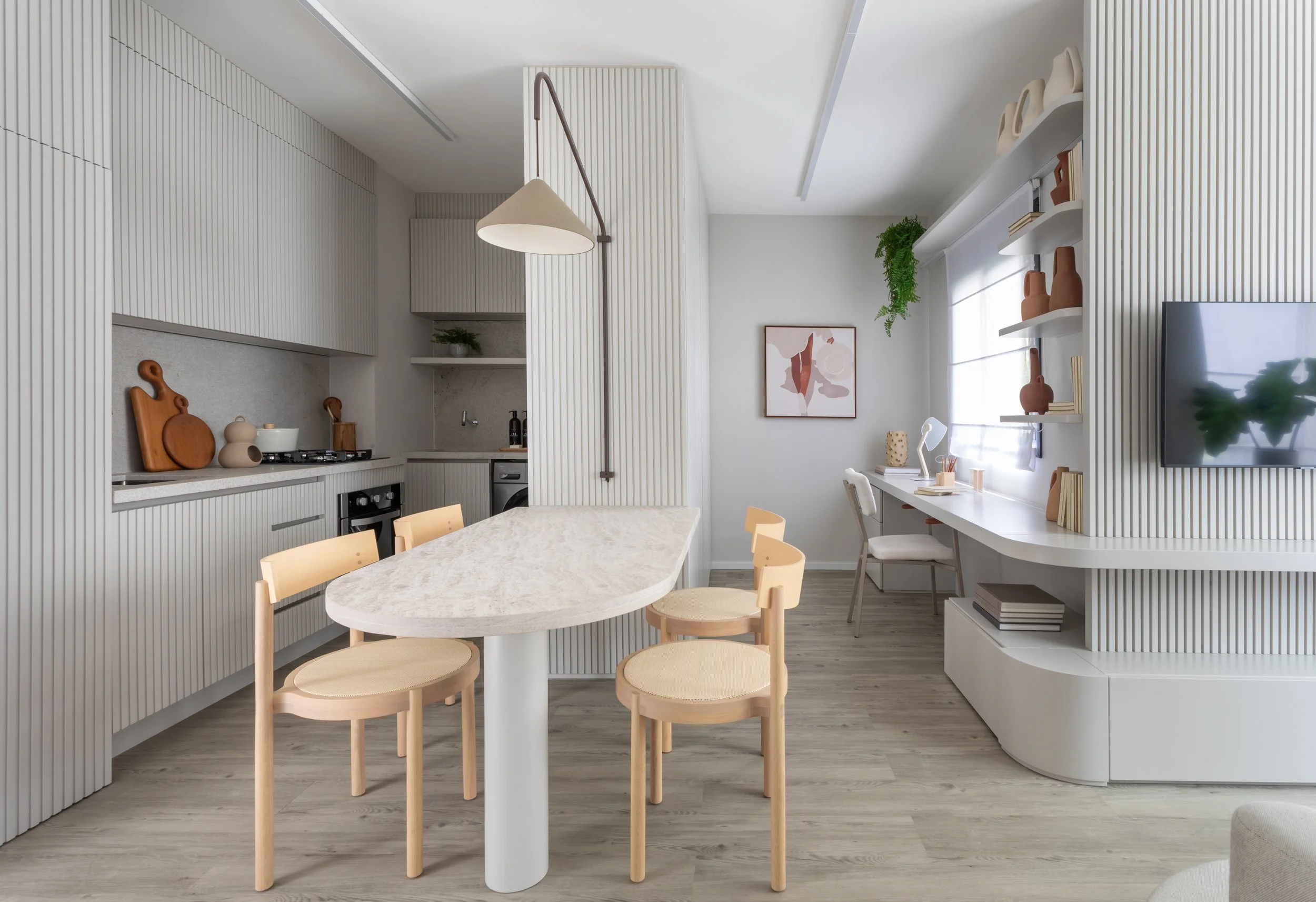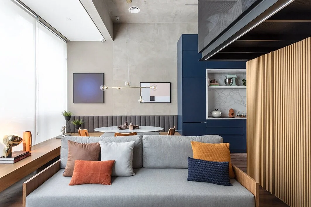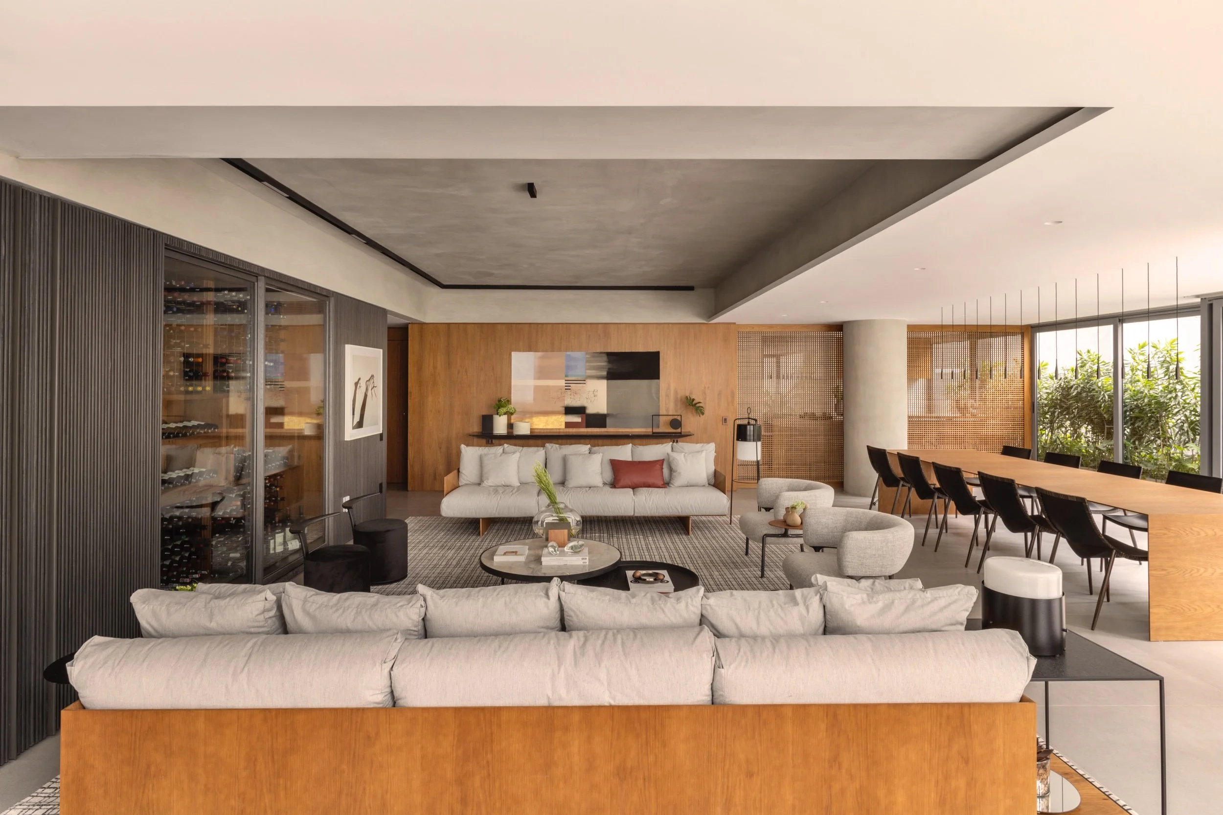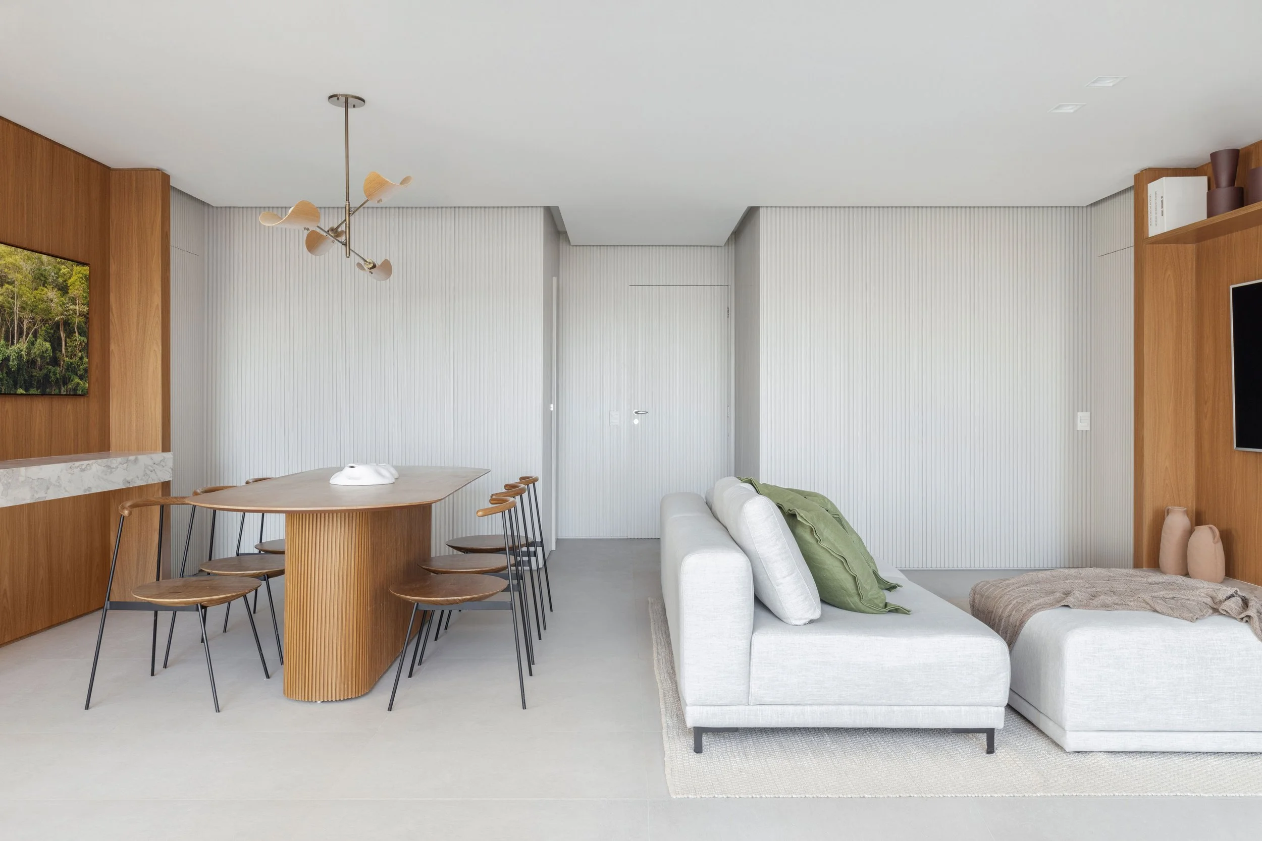 Acabamentos arrojados, mobiliário de design e o painel abaulado com ripas de concreto harmonizam o conceito de um apartamento moderno que vai além de meros espaços sociais.