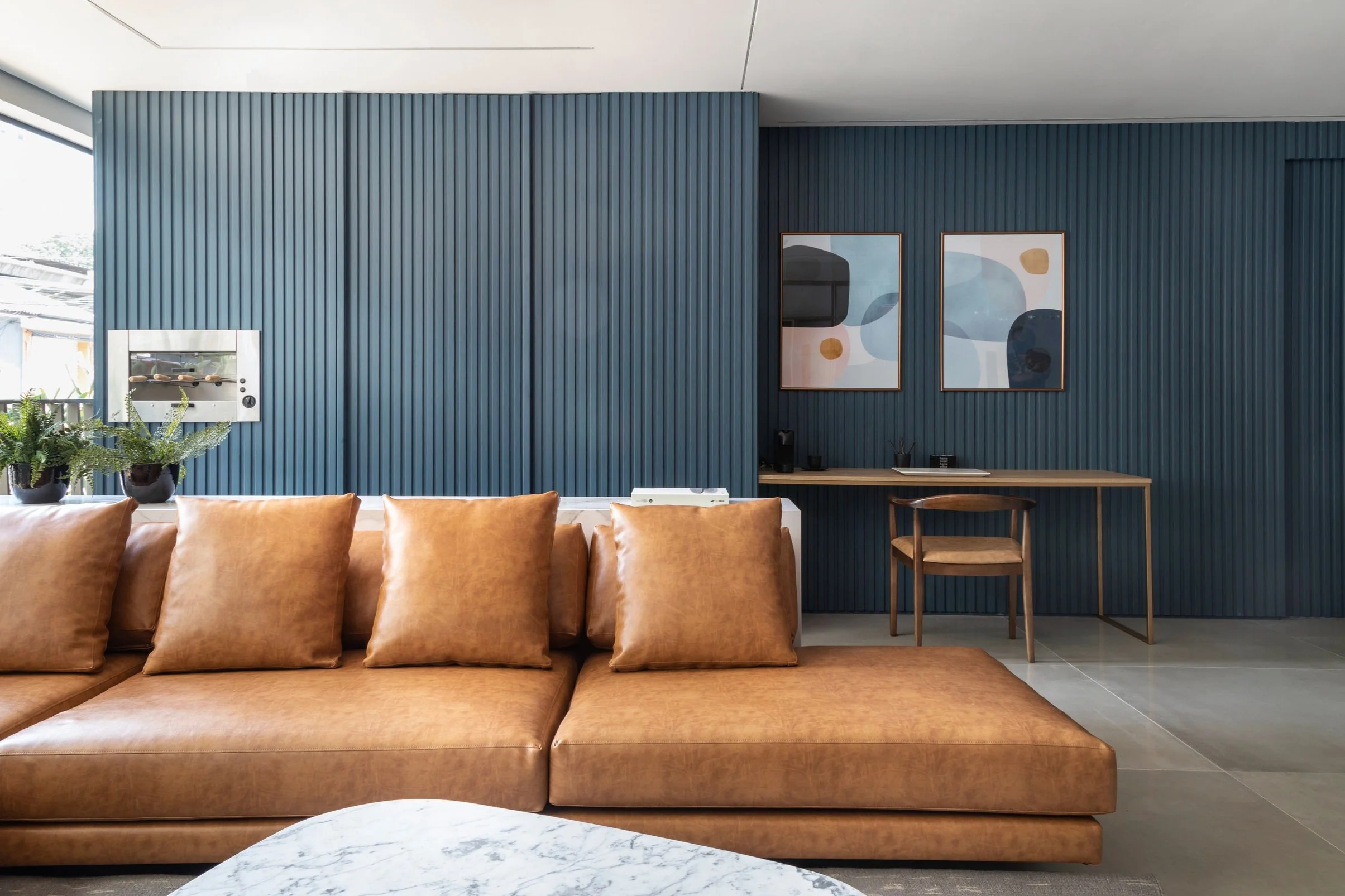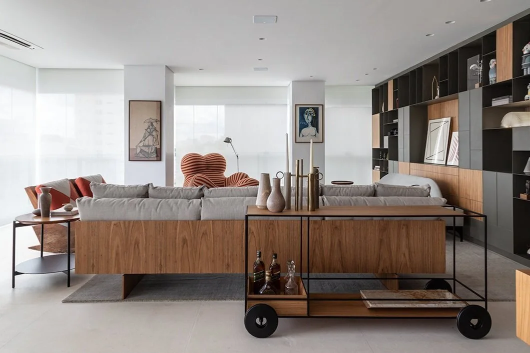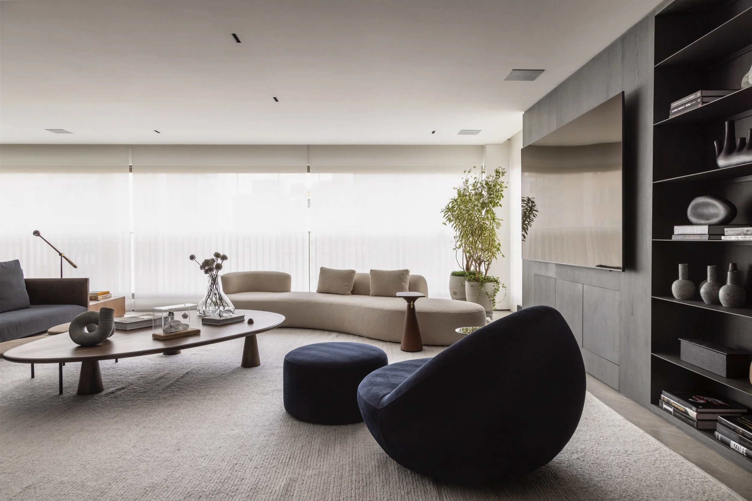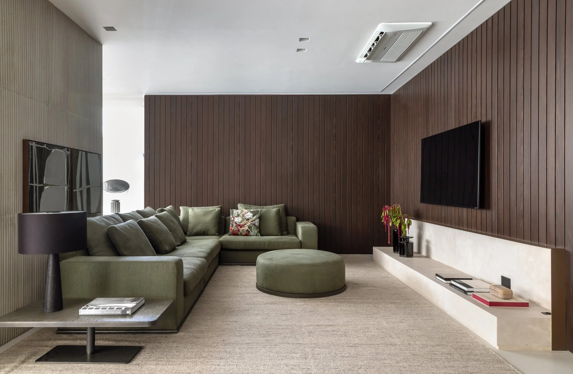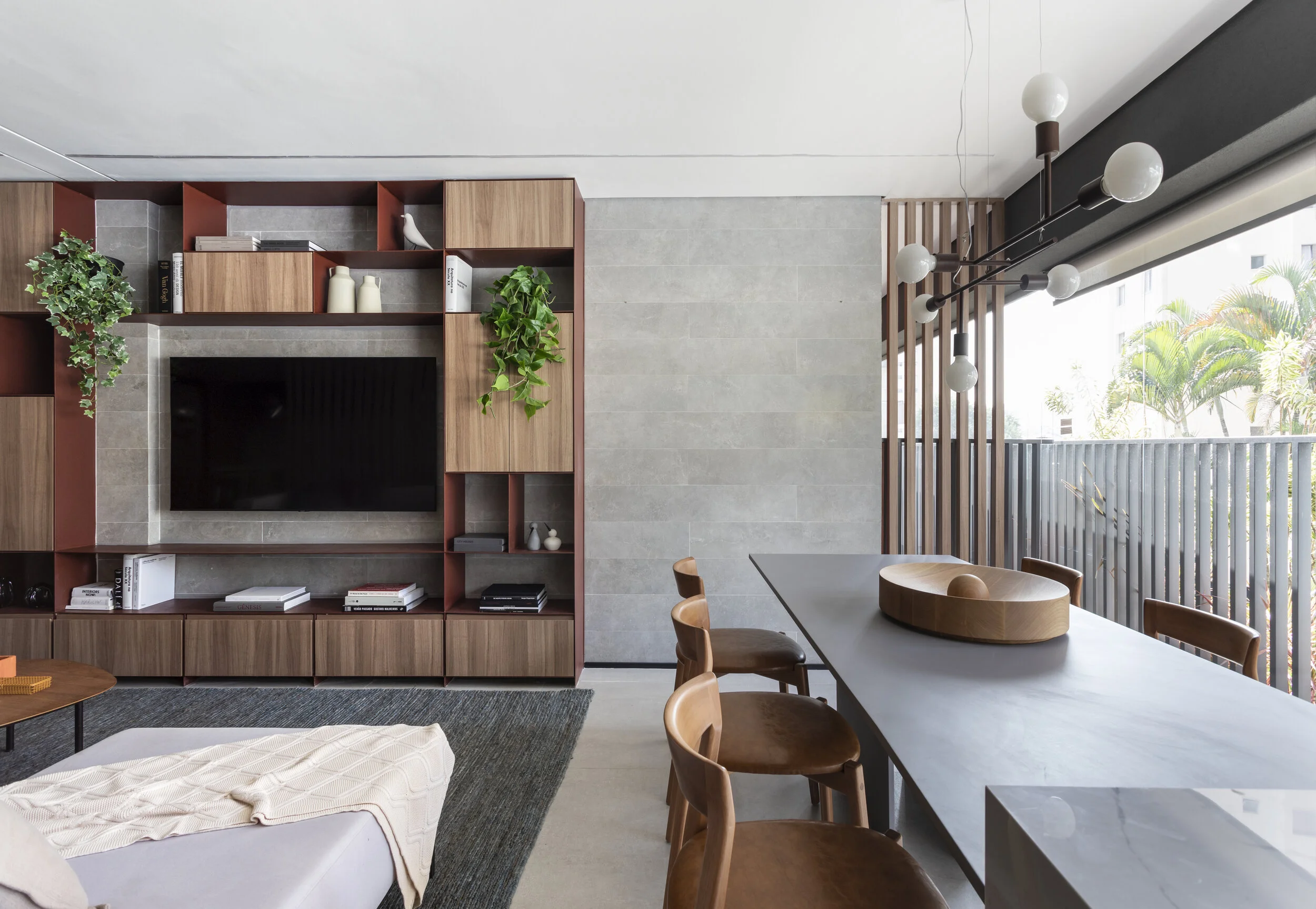 Acabamentos arrojados, mobiliário de design e o painel abaulado com ripas de concreto harmonizam o conceito de um apartamento moderno que vai além de meros espaços sociais.