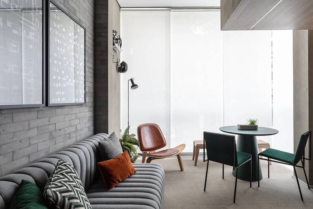 O espírito do empreendimento, que conta com uma torre comercial, é de arrojo e a contribuição primordial do projeto foi integrar living e cozinha ao espaço de jantar. O aproveitamento da luz natural em todos esses ambientes arma um conjunto harmonioso, que foi preenchido majoritariamente com peças de jovens designers. Por exemplo, a luminária Jabuticaba de autoria de Ana Neute e a mesa de centro Lena de Bruno Carvalho.