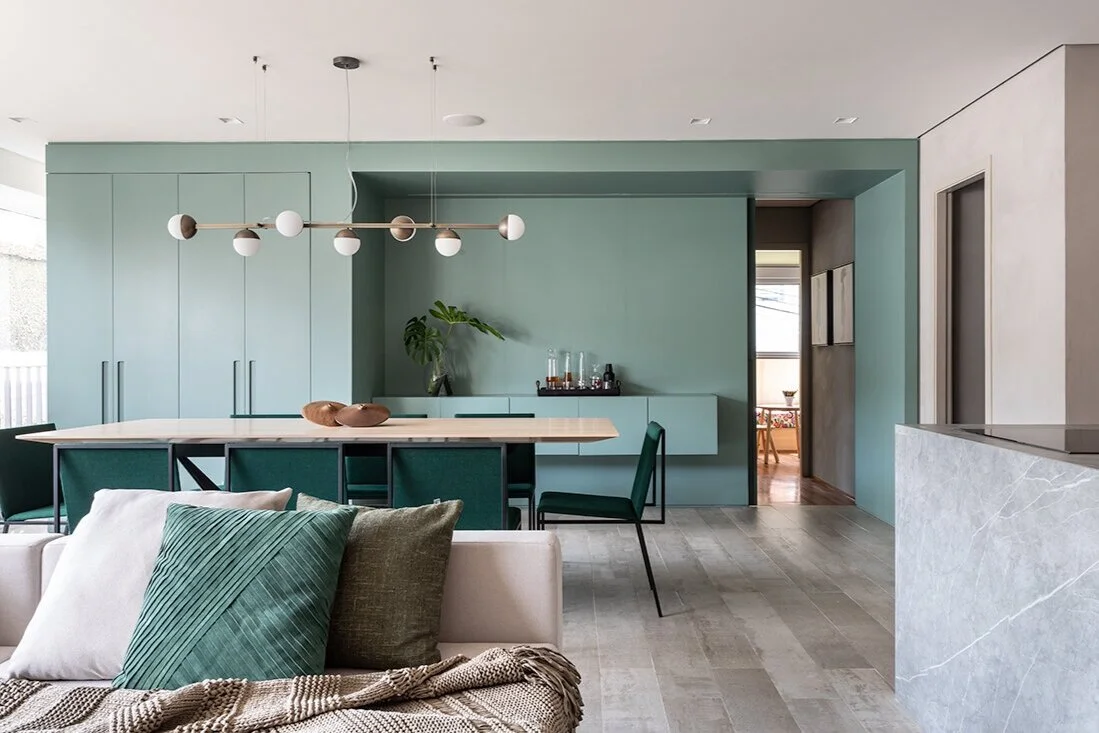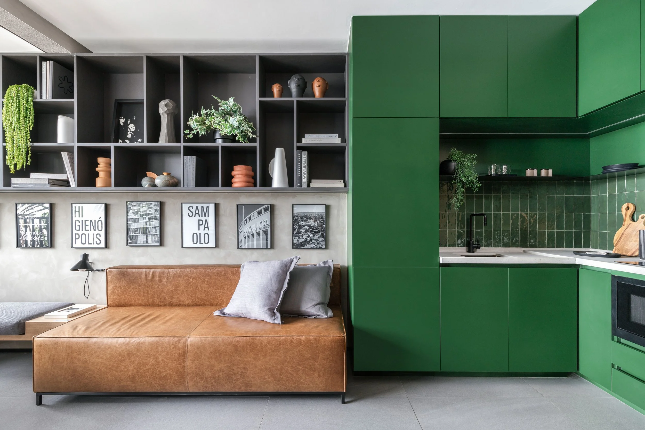 Apesar dos limites muito bem colocados, há detalhes que aparecem em todos os cômodos, como o verde nos bancos da cozinha, na cabeceira dos quartos e nas almofadas do sofá.