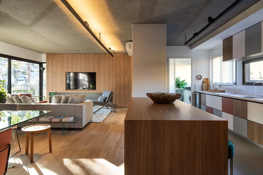 O projeto atribuiu a todos os ambientes a mesma paleta de cores: o bege claro no piso e nos painéis em madeira freijó, que manteve a unidade em áreas tão diferentes como a copa e a sala de estar.