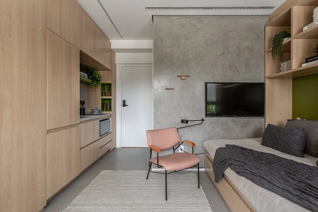 A vantagem neste empreendimento imobiliário é ter a lavanderia coletiva, e isso deu ao projeto mais folga para trabalhar a dimensão exígua do estúdio. Projetos assim, requerem atenção especial para respeitar as dimensões mínimas funcionais. Bem como exigem uma aplicação de recursos que gerem mais impacto no conforto do morador. Por exemplo, a marcenaria feita em toda a parede do comprimento, que é armário de quarto e armário de cozinha com refrigerador embutido.