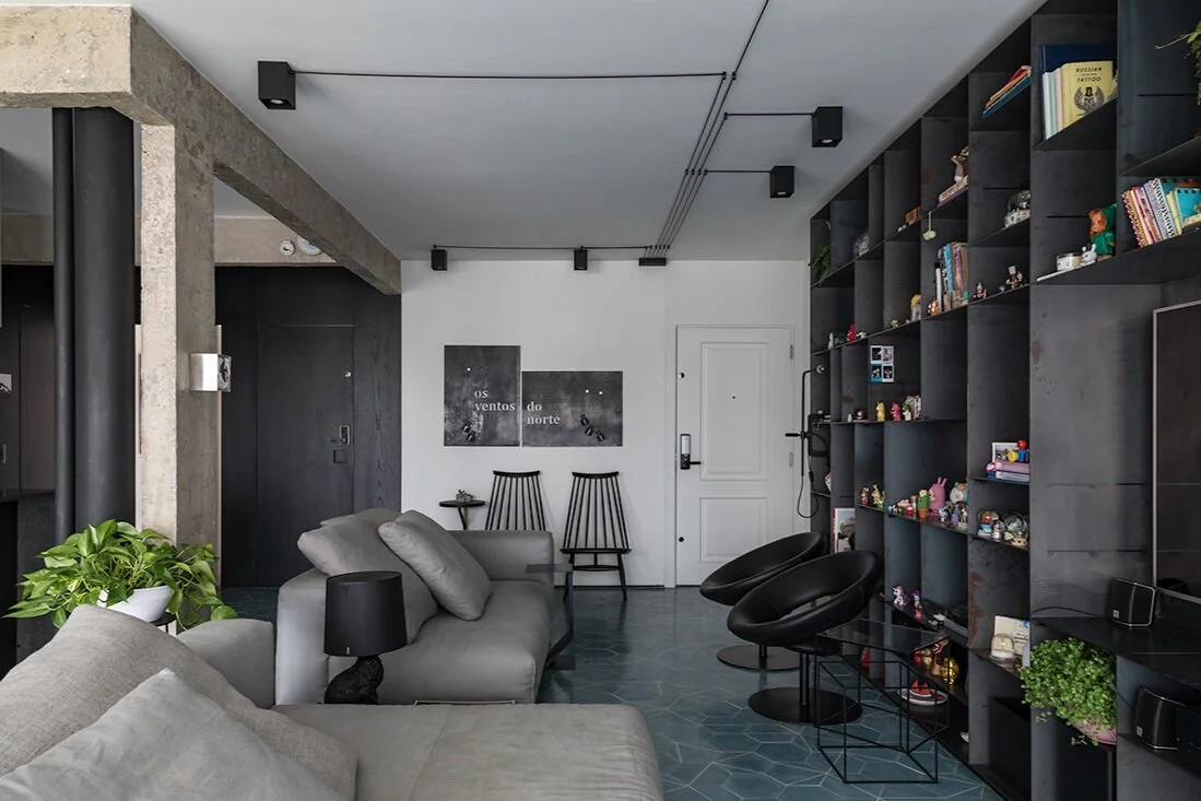Com liberdade para sair do convencional, afinal os proprietários apreciam o design arrojado e queriam um apartamento moderno, se potencializou o contraste de cores: o piso foi ebanizado e as vigas de concreto em boa parte das salas não foram camufladas. Luminárias, poltronas, mesas e tapetes escolhidos entre o que há de mais vanguarda falam diretamente da personalidade do apartamento DUO e seus moradores.