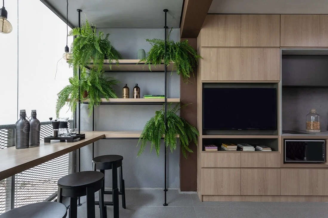 Um apartamento tipo garden, que ocupa o primeiro piso de um edifício, tem a vantagem de uma área externa típica de casas térreas, mas servido das facilidades de um condomínio, sem a manutenção trabalhosa das residências. O projeto realizado no GARDEN JL é um convite para a integração dos espaços físicos, mesclando os interiores com o externo, aproveitando a luz e a ventilação natural. Foi um triunfo das portas de vidro, que expandem todo o apartamento para a varanda protegida agora por uma engenhosa cobertura.