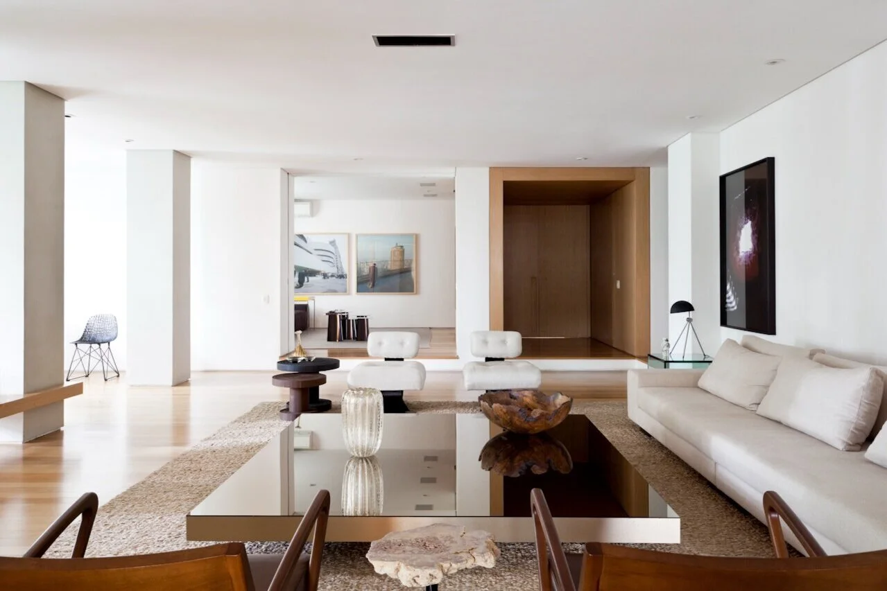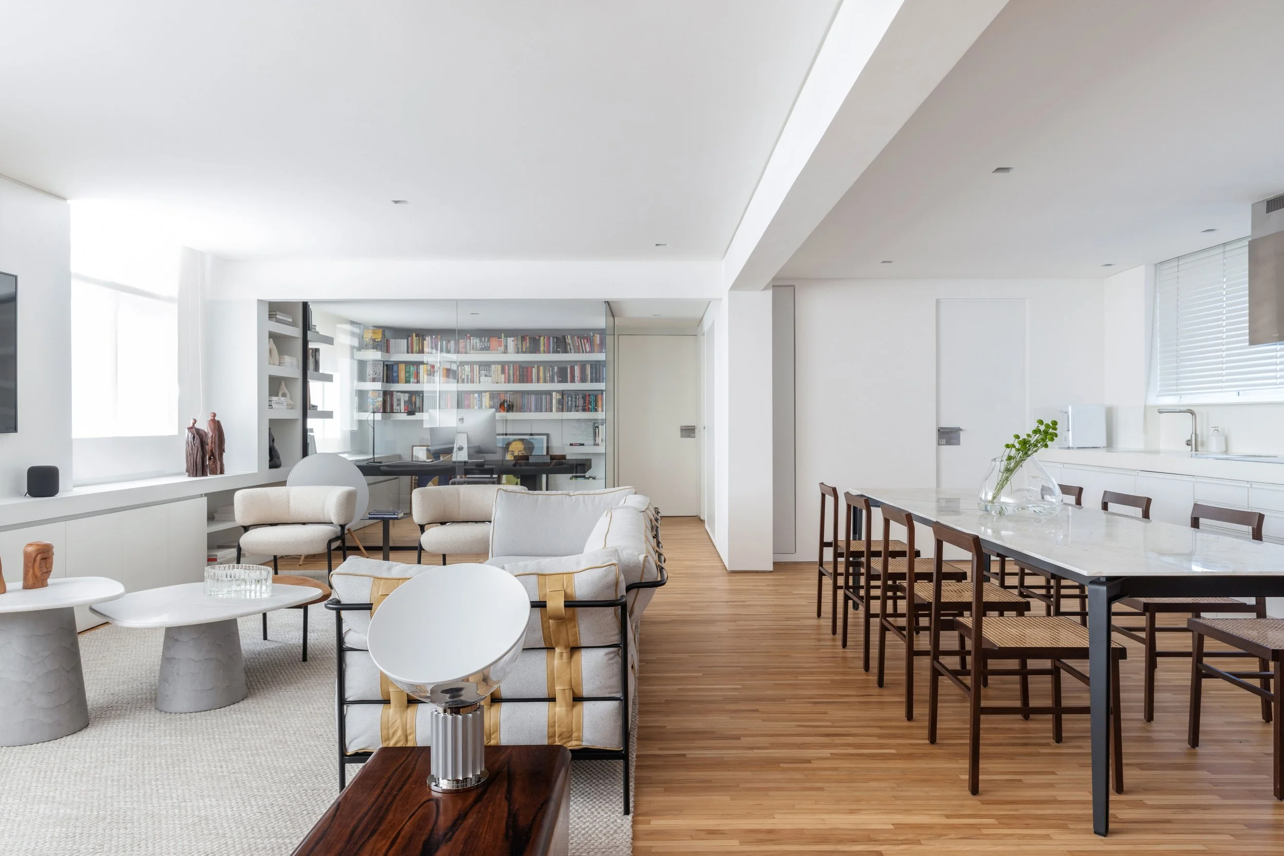 Na entrada do apartamento, do pórtico em madeira freijó o olhar alcança a mesa de jantar e a sala de estar ao mesmo tempo. Essa amplitude magnífica recebe quem chega a esse imóvel na capital paulista com máxima claridade. Foi desejo do casal de proprietários que a planta de 170m2 tirasse bastante proveito da luz natural e assim foi executado o projeto de interiores: nada encostado nas varandas debruçadas sobre o bairro dos Jardins e uma estante de laca branca, que amplificou a sensação de luminosidade.