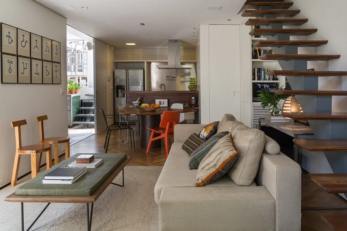 Setorizadas a área de serviços de cozinha e a área do banho, todo o restante foi mesclado numa simbiose de conforto e praticidade. Cada detalhe foi projetado para dar utilidade ao lugar, como os degraus que sobem para o mezanino, construídos para também serem gavetas.
