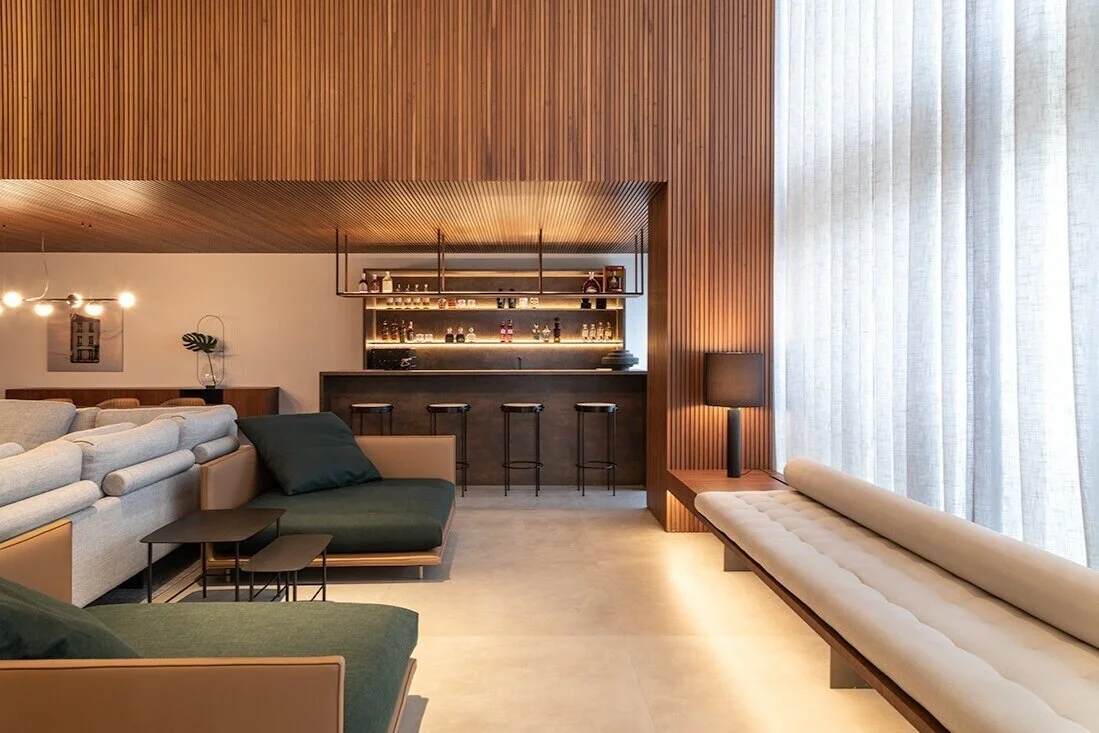 É um projeto para ampliação do convívio, para a troca entre as pessoas. Um trabalho de arquitetura generosa onde buscamos contrastar os acabamentos, utilizando uma madeira mais escura nos painéis de marcenaria e tons mais claros nos porcelanatos e nas pedras.