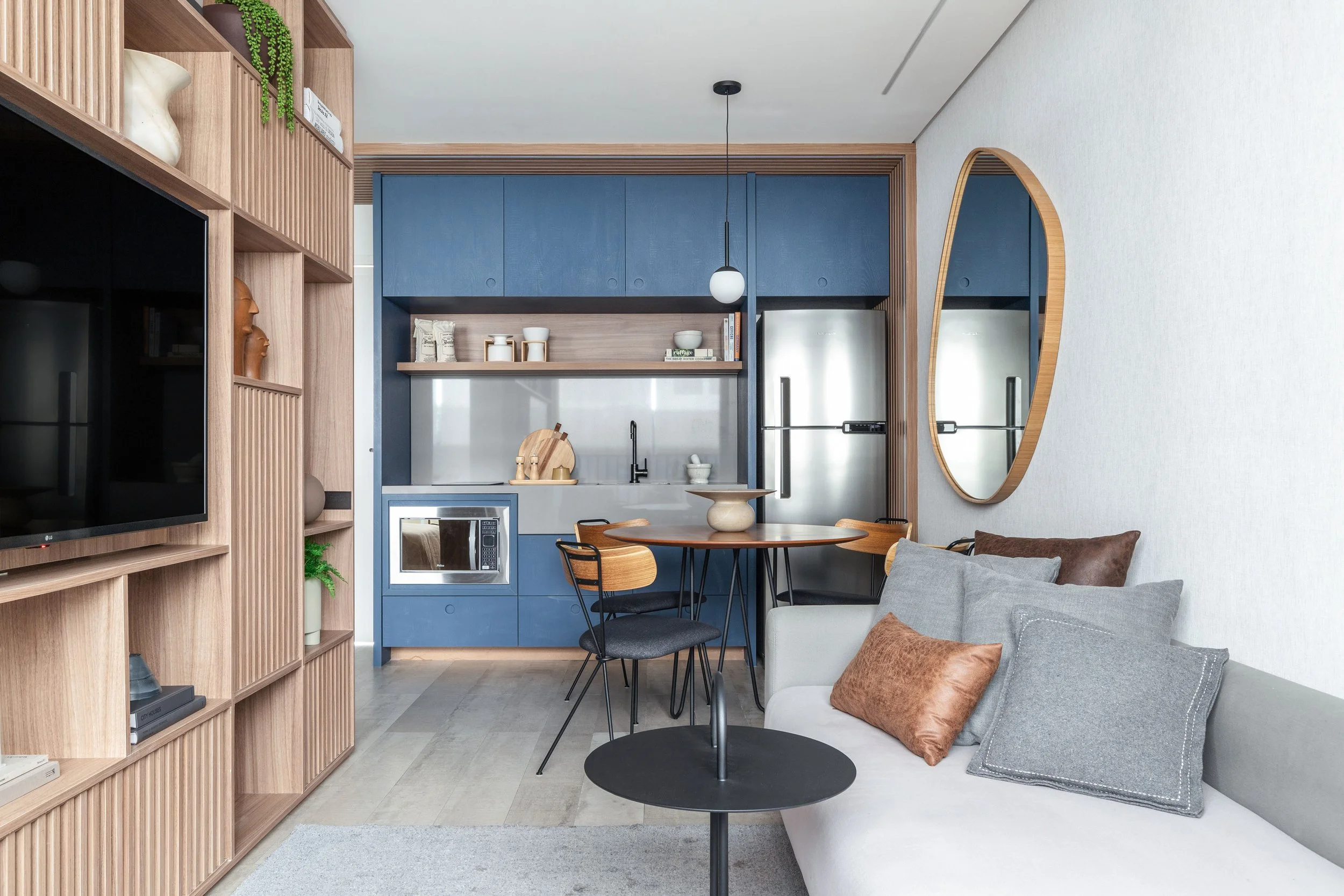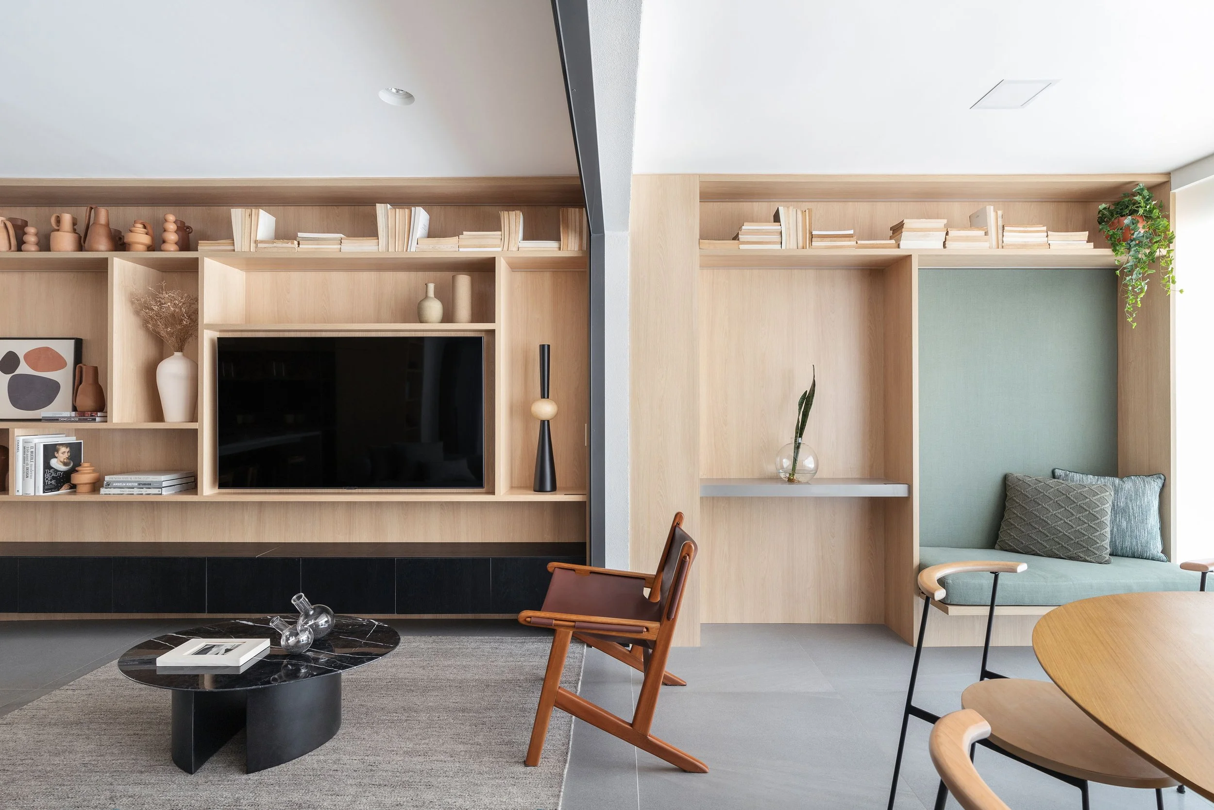 Neste projeto foram setorizados os itens funcionais, como microondas, bancada, geladeira e televisor. Foi importante deixá-los de um lado do estúdio e planejar tudo sob medida. Como esta parte desempenha múltiplas funções é primordial que o visual seja clean evitar a sensação de sufocamento e bagunça; a escolha das portas sem puxadores aparentes e com uma madeira de tom claro fizeram esse objetivo ser alcançado.