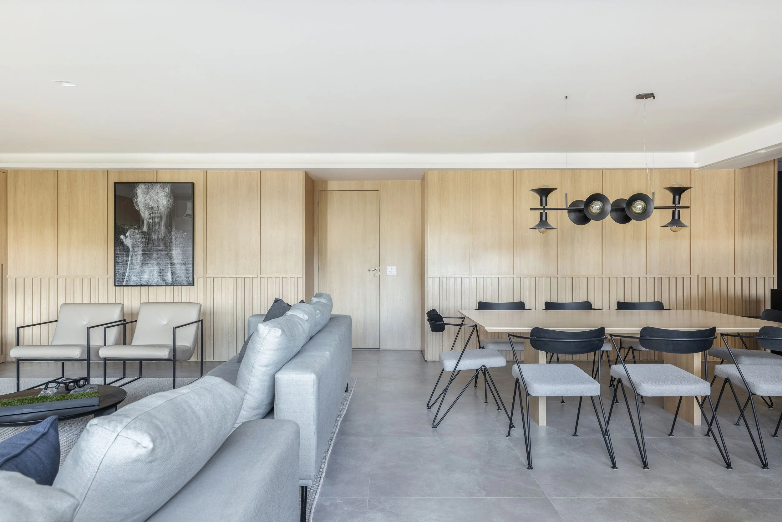 A modernidade do apartamento IL Bosco vem ao encontro de um desejo ancestral: a formação de uma família e o espaço de que ela precisa. Os jovens clientes elegeram um projeto que integrasse a sala de estar ao jantar, que a mesa de almoço pudesse receber companhias numerosas e o living fosse revestido de madeira para o ganho extra de conforto, acústica e temperatura. Em suma, o ninho perfeito.
