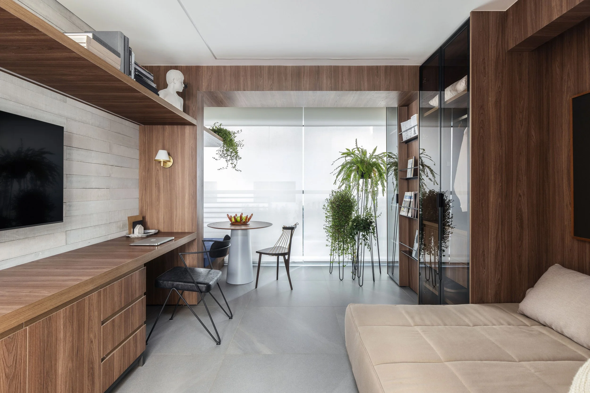 O mercado para imóveis do tamanho do estúdio Platô está em franca expansão e para esses casos não é possível escolher mobiliário com proporções de casa de campo. Neste projeto, foram colocados móveis soltos e uma marcenaria sob medida, que intercala espaços cheios e vazios. Assim, o estúdio não fica entulhado nem com cara de depósito. Ao contrário, a organização limpa o visual, o aproveitamento da luz natural amplia o ambiente e as plantas trazem vida, que são tudo o que não se encontra num famigerado quarto de hotel.