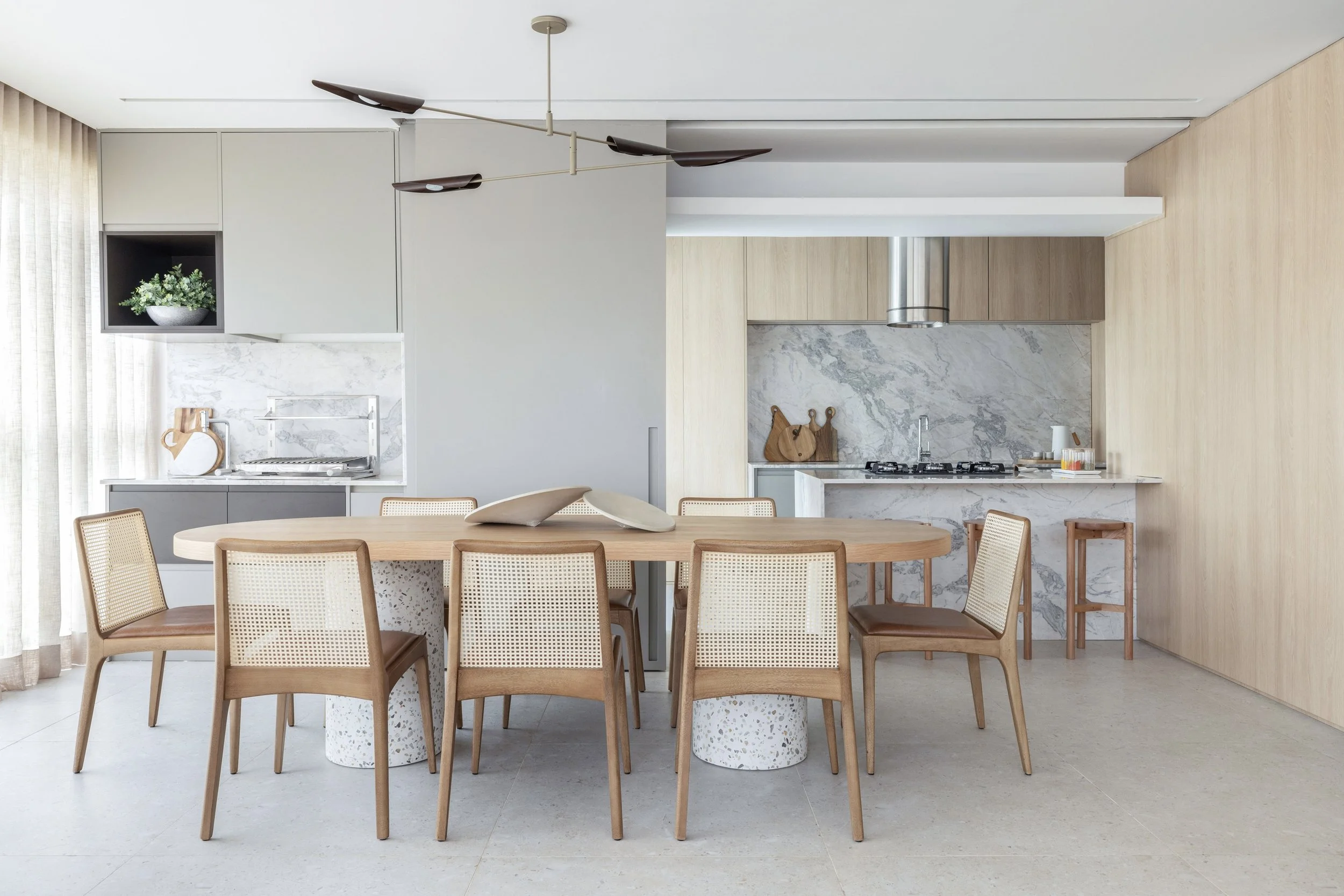 Em obras assim, que integram ambientes, foi importante a cozinha seguir a estética da área social - dessa maneira de fato os cômodos se conjugaram. Armários grandes armazenam eletroportáteis e organizam o visual. A cor branca usada intensamente em painéis, marcenaria e mobiliário (junto com a madeira carvalho) criou amplidão e trouxe mais luz ao espaço.