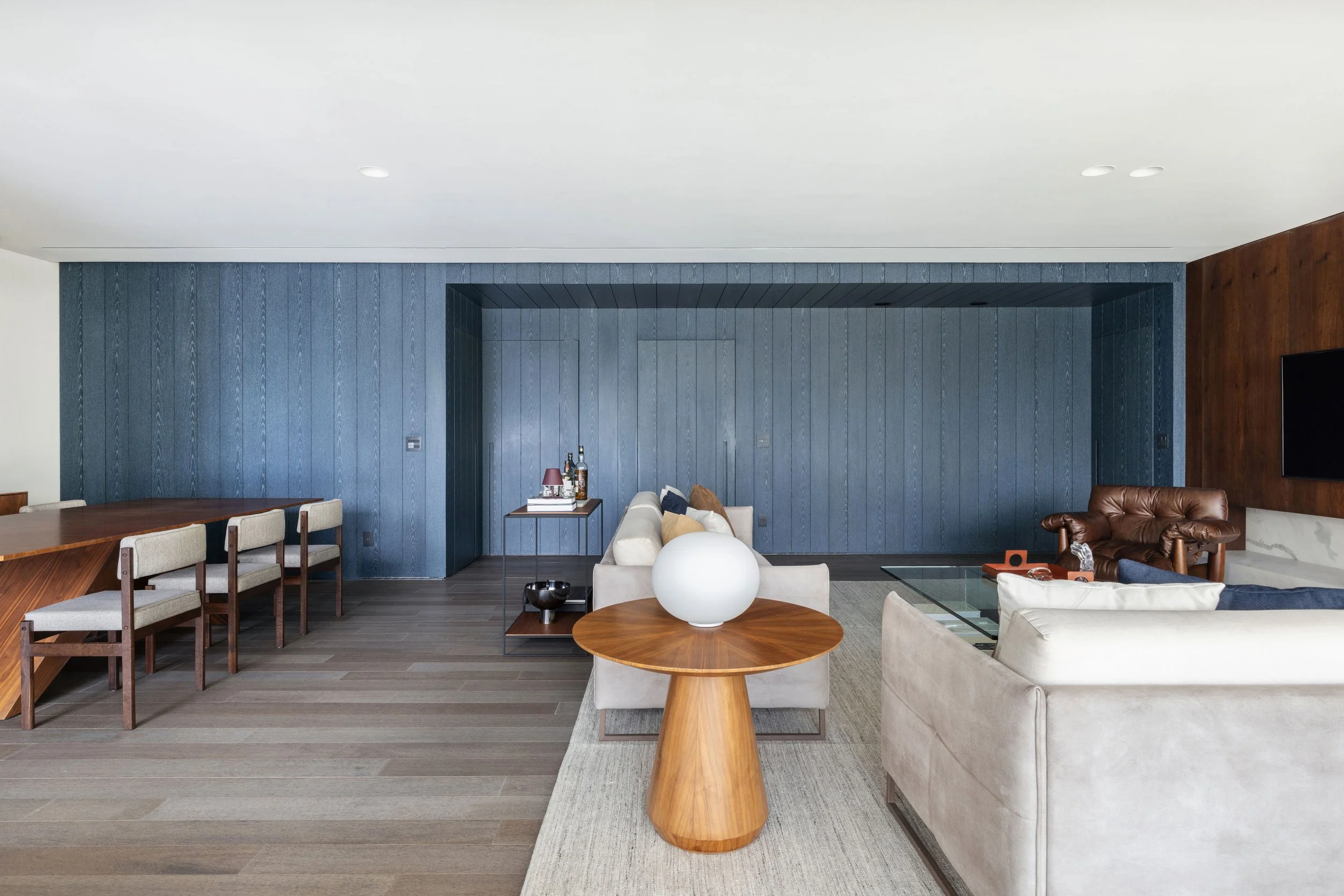 Feita em madeira azul, ela serve como uma conexão do apartamento, ligando a porta de entrada à circulação da área íntima, cozinha e lavabo. Tudo mimetizado graças a encaixes perfeitos e minúcia no acabamento. O piso cinza e a nogueira nas paredes exercem sua influência de temperaturas, ora mais quente, ora mais fria, quebrando a monotonia. E essa paleta de cores mais profundas cria um pano de fundo para as peças de design, como o mobiliário Sérgio Rodrigues, que assina a poltrona Mole e a cadeira Tião.