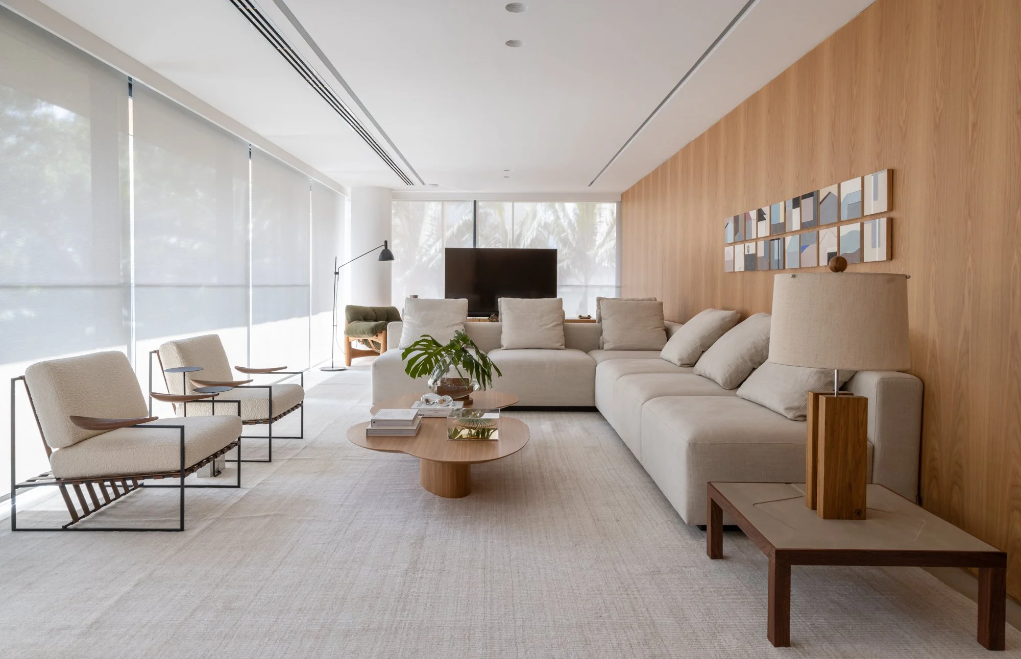 O mobiliário escolhido tem peças importantes, com personalidade. Como a poltrona Mole de Sergio Rodrigues, as poltronas Anette de Jorge Zalszupin e o aparador Wyllis de Arthur Casas. Nesse ambiente sofisticado, os tons neutros embaralham tudo com delicadeza e dão um resultado elegante. Fórmula que também pode contar com os painéis nas paredes, em lâmina de madeira carvalho natural, camuflando as portas do lavabo, da sala íntima, da cozinha e do frigobar.