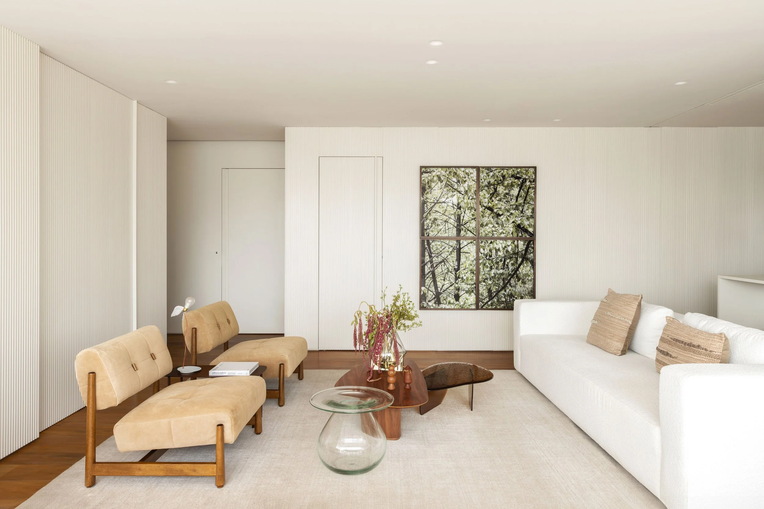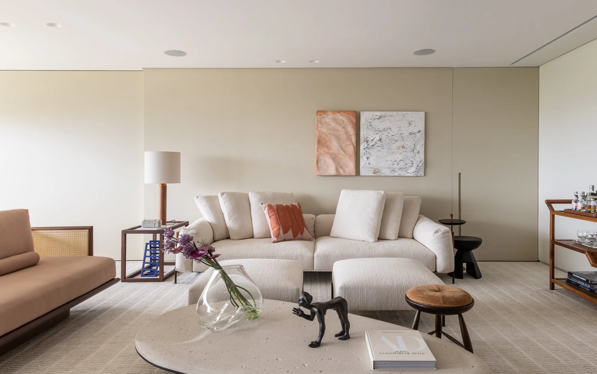 Sem modismos, o piso em limestone de tons nude congrega dormitórios e ambientes sociais na mesma paleta. Uma proposta de apartamento feminino e atemporal.
