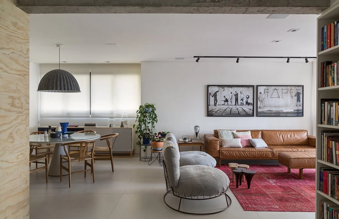 O tapete iraniano estonado em vermelho - xodó dos moradores - foi o ponto principal de cor. Sobre ele contrastaram elegantemente os móveis em couro e cores neutras.
